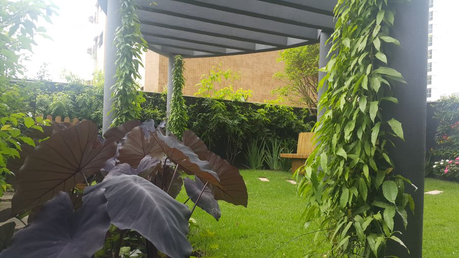 Esse projeto foi desenvolvido para a Construtora Belmmen, no empreendimento Ritz Class Jaguaruna, com o título de praça das flores, onde foi criado um belo espaço de convivência com pergolado, árvores frutíferas, flores em todo contorno dos muros, possibilitando uma harmonia perfeita para os usuários. Todo construído sobre laje e com profundidade de 30cm apenas. Sistema de irrigação automático foi fundamental, utilização de drenagem eficiente e solo formulado pelo engenheiro agrônomo especialista.