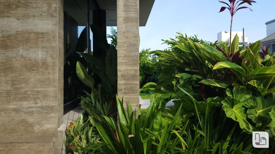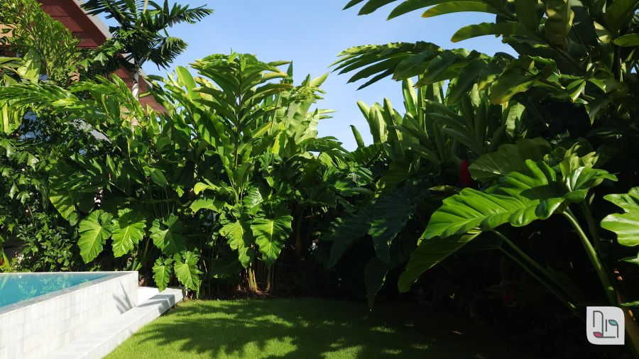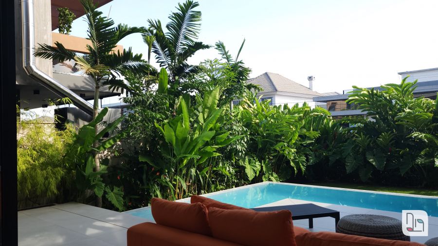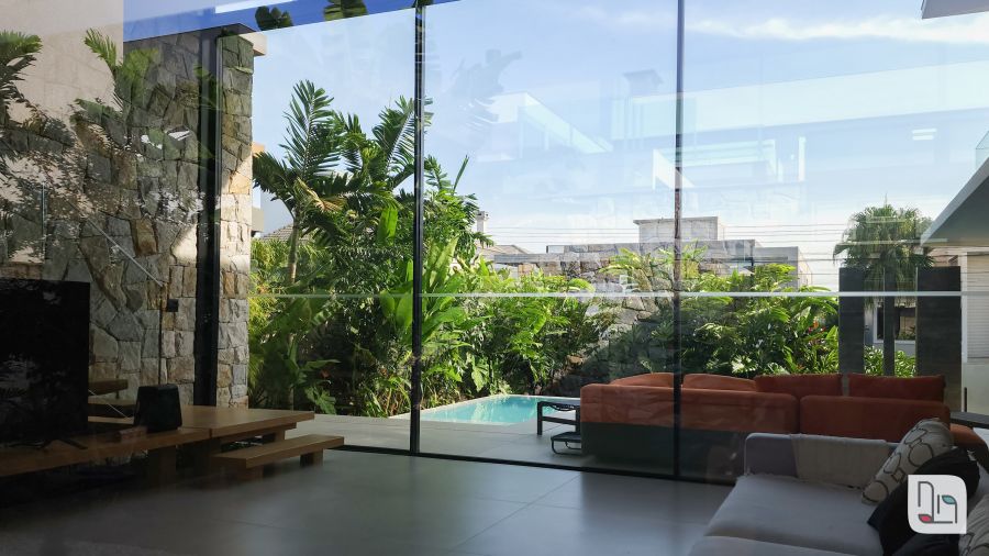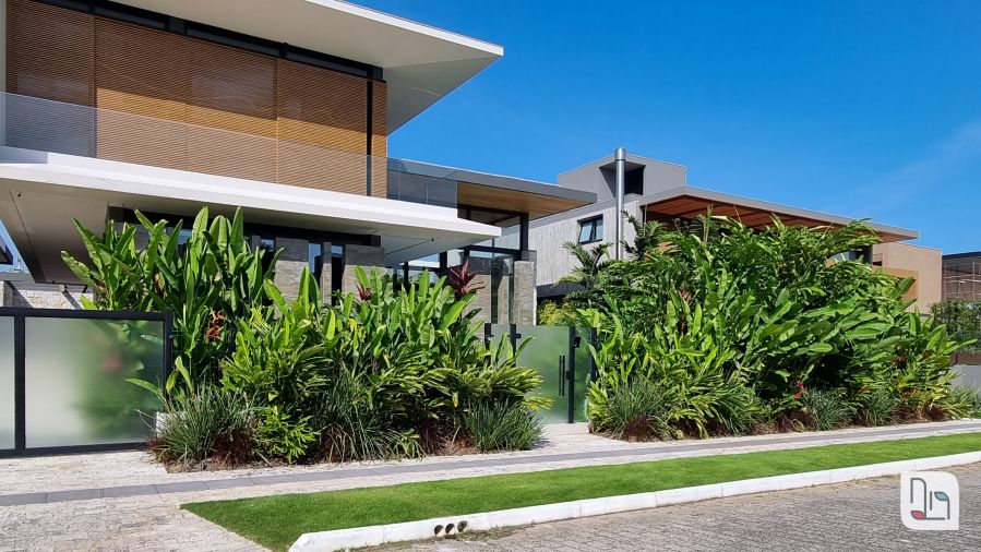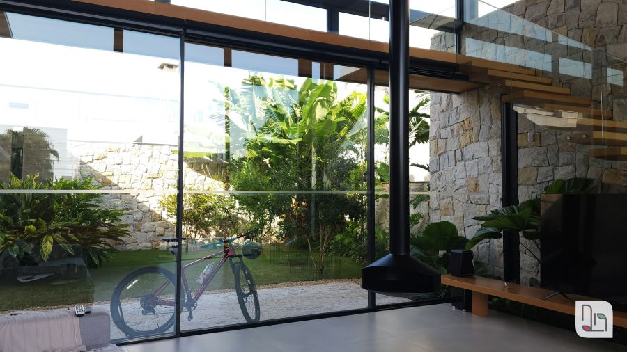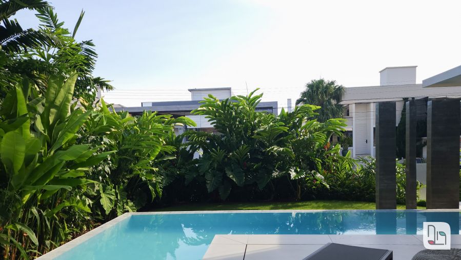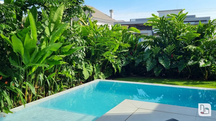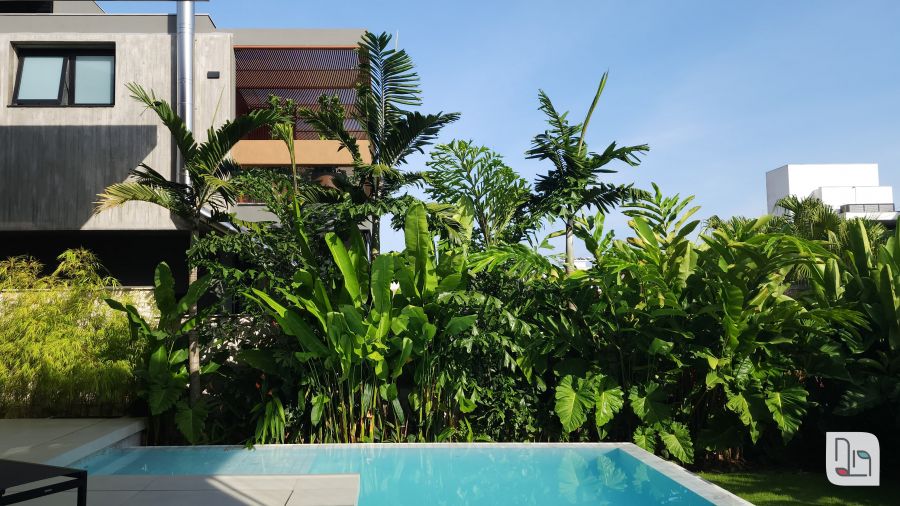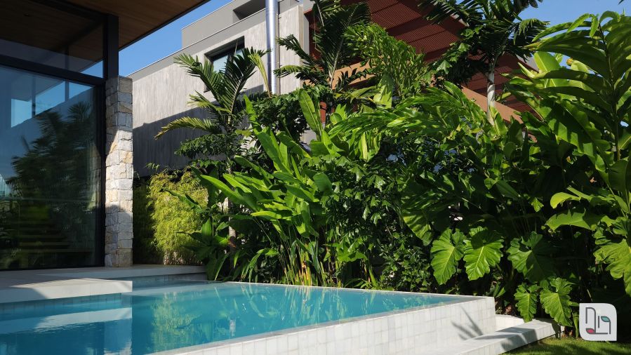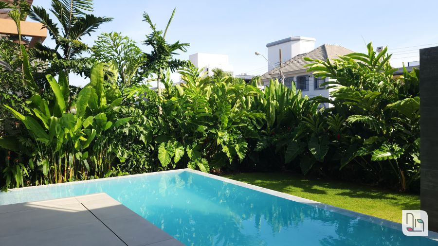 Um dos aspectos essenciais é a capacidade de proporcionar privacidade de maneira orgânica. Em casos onde a arquitetura moderna prioriza a ausência de muros ou barreiras pesadas, como é o exemplo dessa residência abaixo com amplas áreas envidraçadas e uma piscina na frente do terreno, é necessário utilizar vegetações estrategicamente escolhidas para garantir a privacidade dos moradores.
